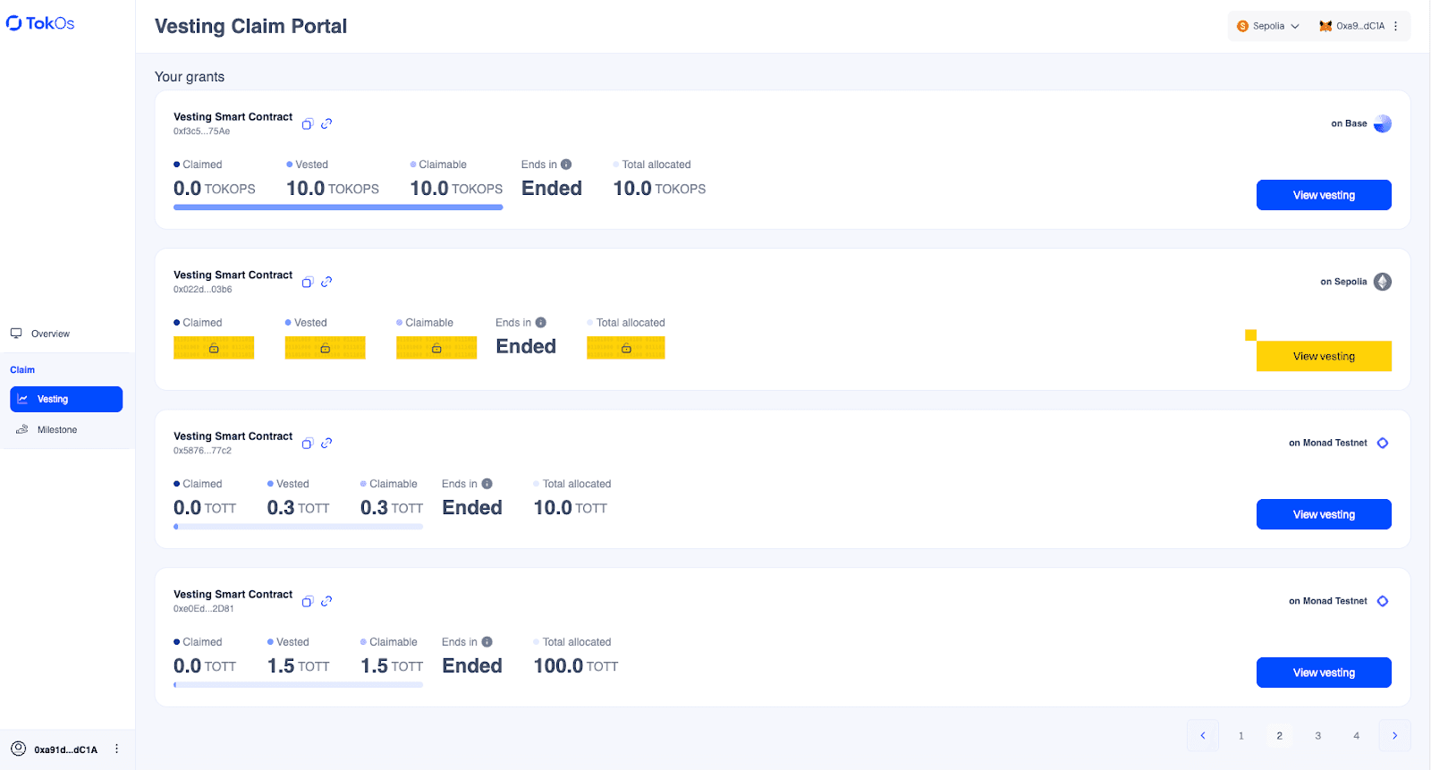 Users connect their wallet to the TokenOps claim app to view all vesting contracts where their address is a recipient. TokenOps automatically indexes the wallet across chains to surface active distributions. The above interface displays three standard vesting contracts with full transparency (allocated amounts, claimed amounts, remaining balances publicly visible) alongside one confidential vesting contract (yellow boxes) powered by Zama FHE, where key allocation data remains cryptographically obscured.